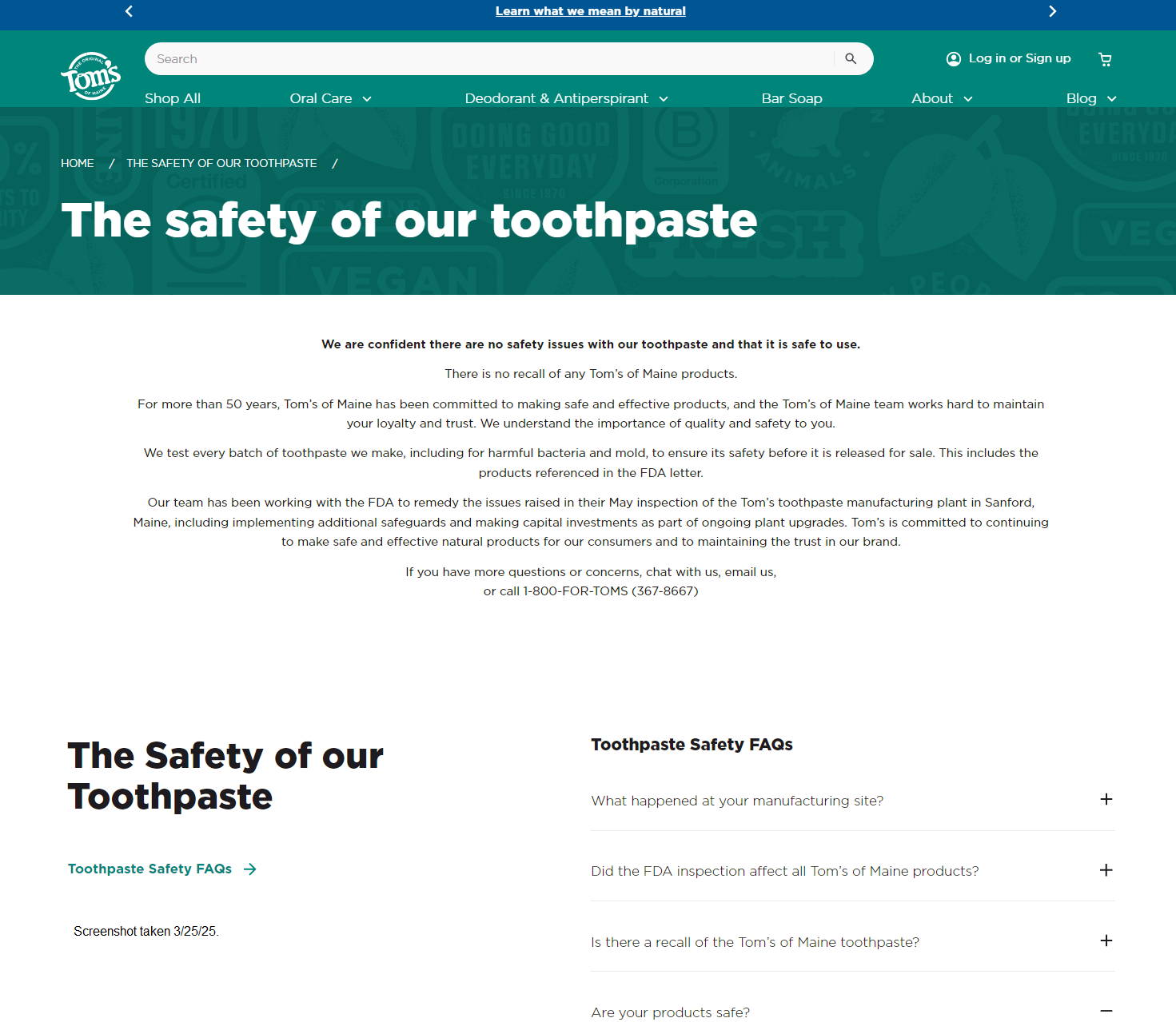They claim they are "confident there are no safety issues with our toothpaste and that it is safe to use" (see screenshot) even after 400 people complained about the color, taste, and odor of its toothpaste.